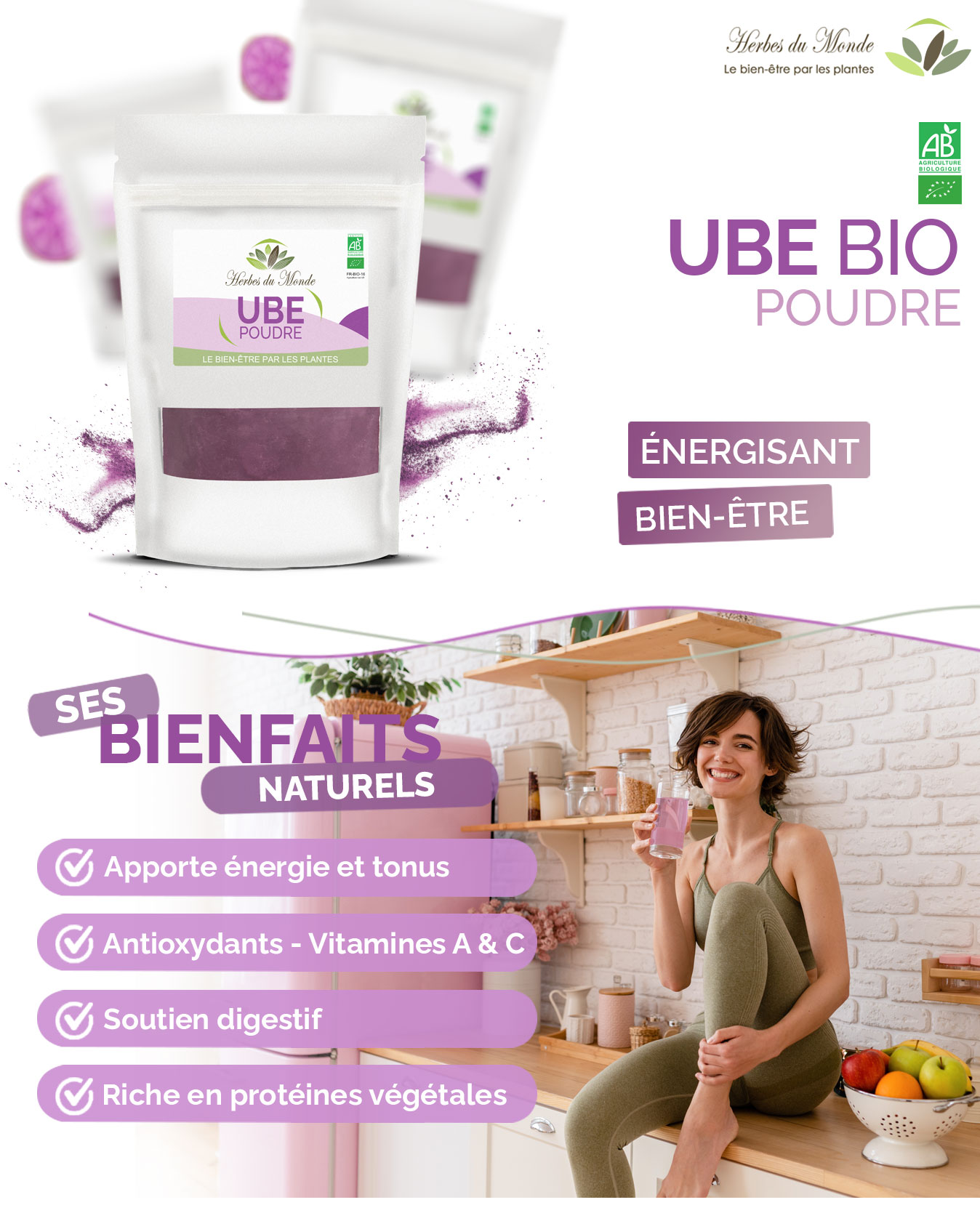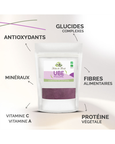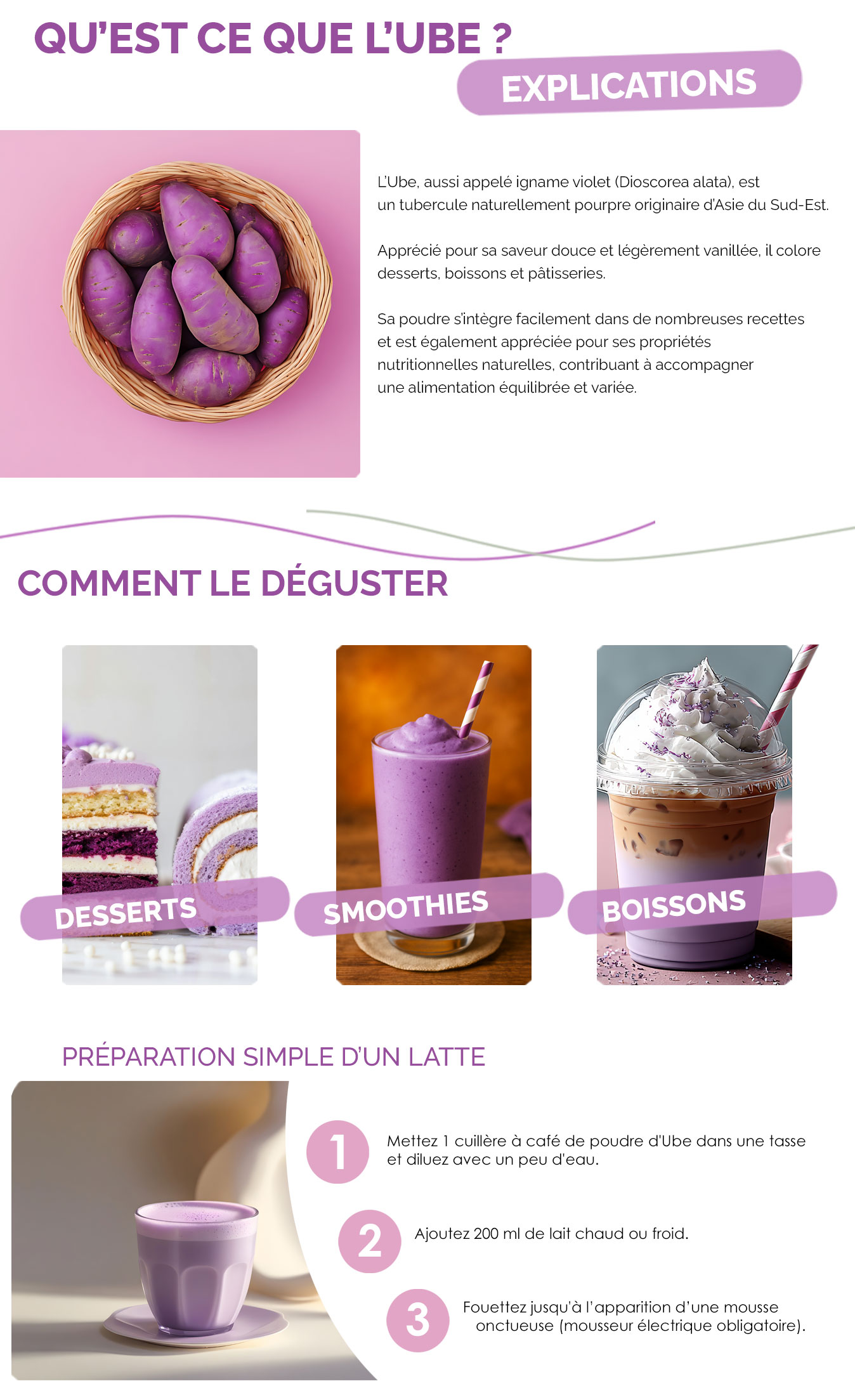 Utilisé depuis des générations, l’ube est reconnu pour sa teneur en fibres, ses glucides complexes et ses antioxydants naturels, qui en font un ingrédient apprécié pour accompagner une alimentation variée et équilibrée.